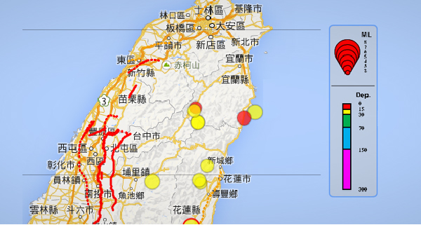 - 本網頁系統主要由中央研究院永續科學中心與科技部資助的研究計劃下所建立,中央研究院地球所負責與中央氣象局協助執行,目的在建置台灣地區的即時地震科學資訊系統,以氣象局的地震速報資訊為基礎整合學界的即時科學成果,提供討論地震物理及地質特性的第一手資料,並期待可作為防震減災應變的科學依據。內容涵括氣象局的地震速報結果,包括發震時間、震源位置與規模,以及各地震度等。這個速報結果將自動觸發學界發展之震源反演的計算,在幾分鐘內即可提供數個運用不同資料、方法與地球震波速度模型的震源解。另外也利用目前普遍安裝在台灣地區的低價位Palert強震儀所記錄的即時觀測震度資訊來計算得到台灣地區震度分佈圖等。包括地質圖、活動斷層、震間變形和地震測站等的套疊圖層,對發震構造的辨識、餘震的評估,以及判斷其他可能觸發之地質災害等將扮演重要角色。